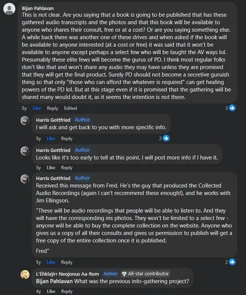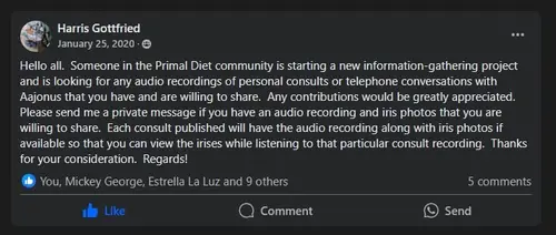 In 2021, 4 years ago, a woman wrote in one of the Facebook groups that she had a recording of her and her family's consults with Aajonus, and wanted to share it with everyone. She asked who to send it to.
