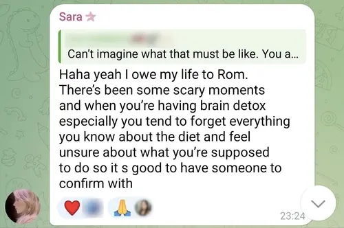 Sara had important detoxification reactions, and was lost at times when she needed to know what to do the most. This is an instance where personal guidance is crucial.