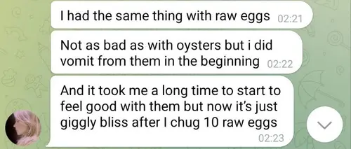 It also worked and eating enough raw eggs can give her "giggly bliss" (something I have observed happen to other people I guided as well).