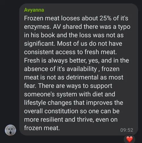 Aajonus' stance is clear. However, Phoenix's wife, Avyanna, writes in their Signal group that Aajonus actually made a typo in his book, that he actually wasn't against frozen meat!