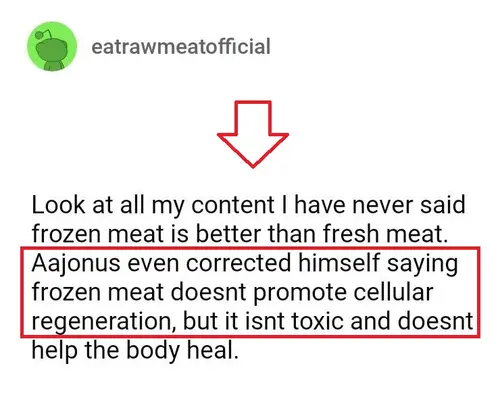 Chris "EatRawMeat", the online abuser who joined Phoenix and says he co-founded their coaching business, also pushes this disinformation. He writes Aajonus changed his mind about frozen meat and wasn't against it anymore.